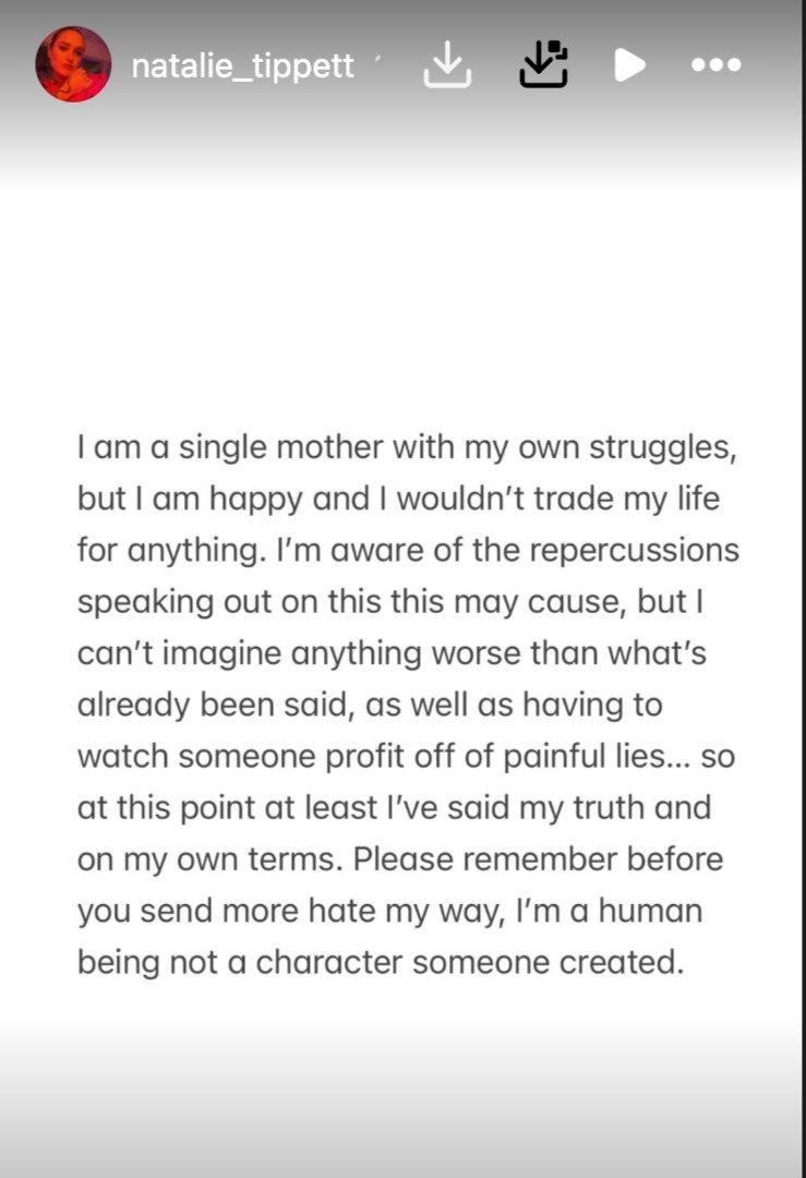 “I’m aware of the repercussions speaking out on this may cause, but I can’t imagine anything worse than what’s already been said, as well as having to watch someone profit off of painful lies… so at this point at least I’ve said my truth and on my own terms,” she wrote.