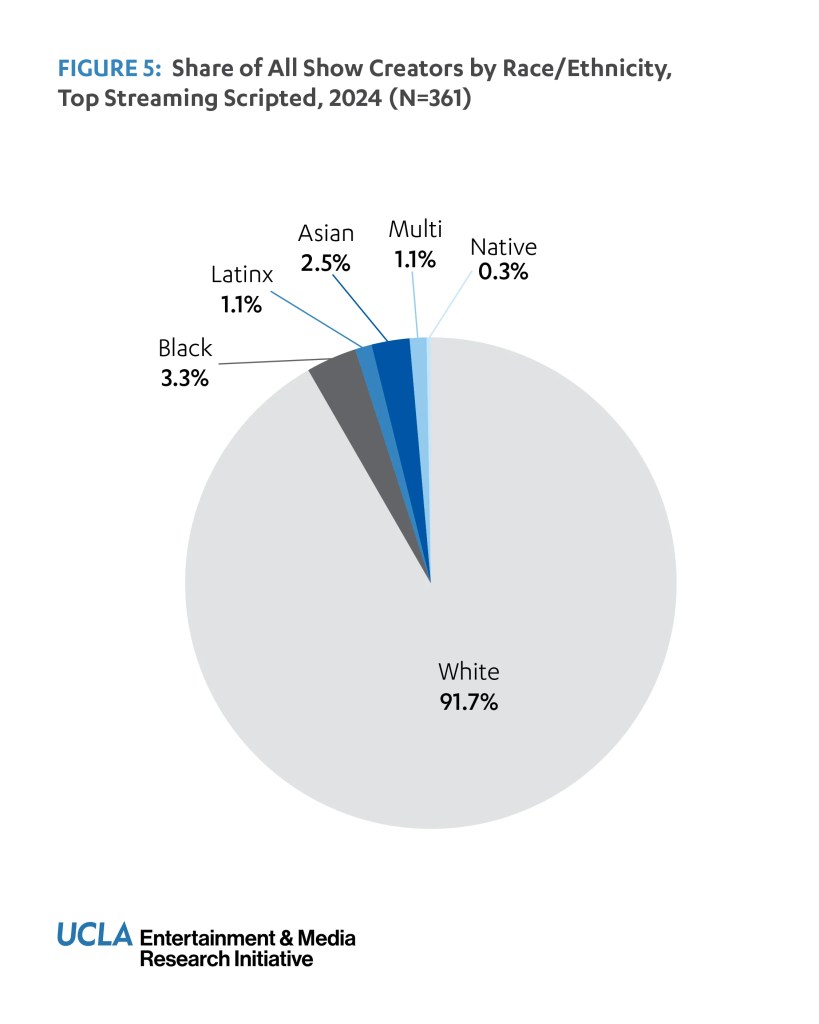 Over 91.7% of these scripted streaming series were created by a white person, and 78.9% were created by a white man — increases from 2023’s data. Only 22% of the top series were made by a female creator.