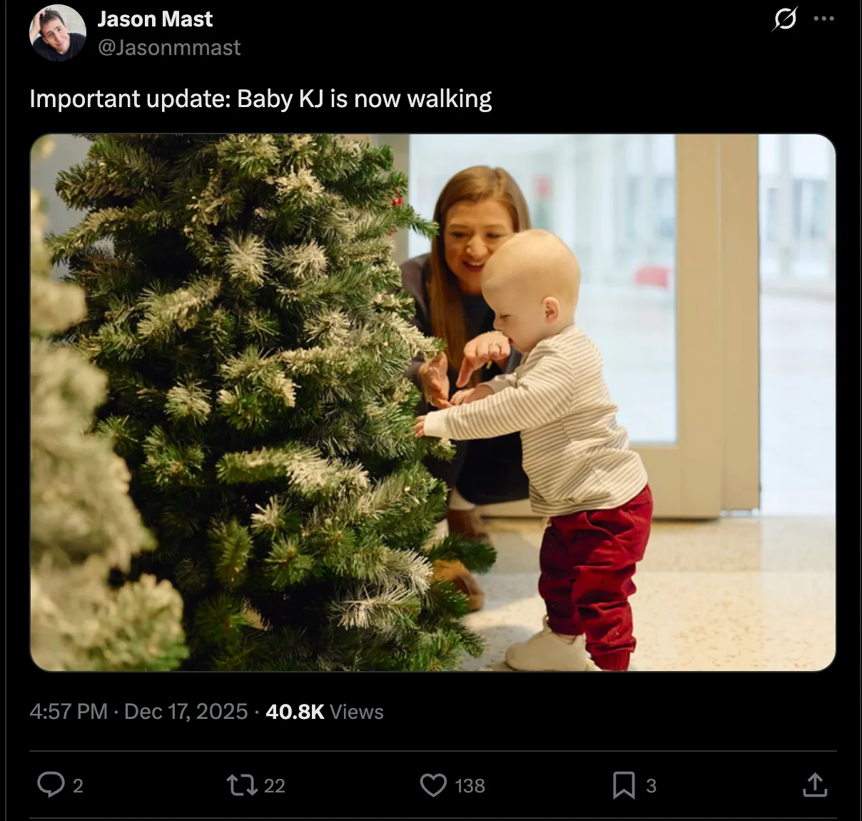 As for KJ, while he will still require lifelong monitoring, he’s doing great. He just took his first steps.