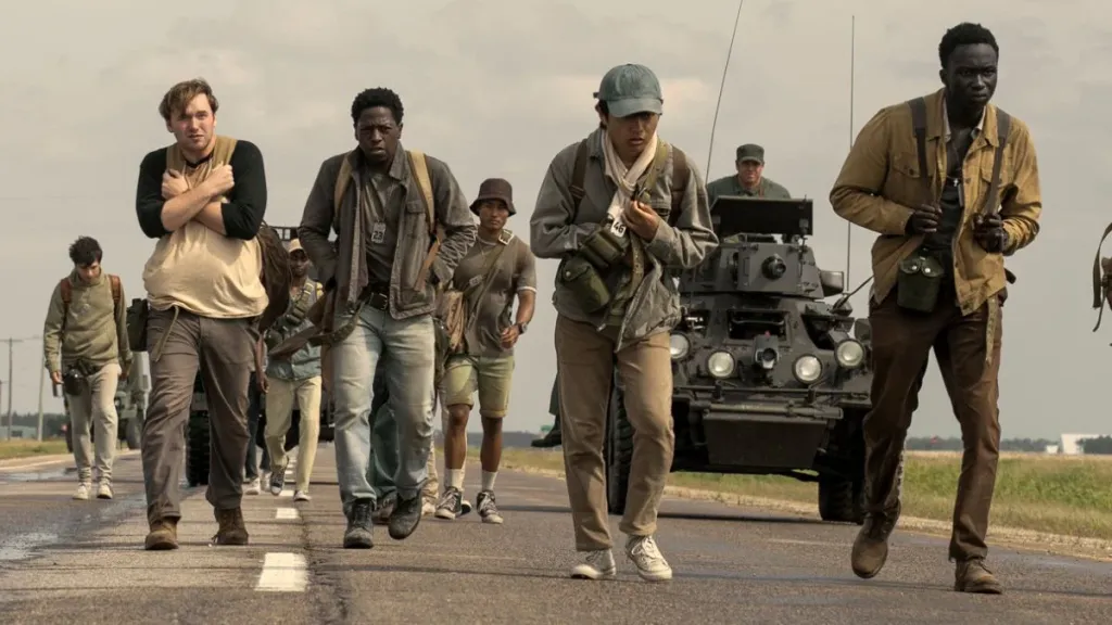 Not only is (almost) every actor constantly marching, they’re also constantly on-screen, because with the exception of a brief prologue and sparse flashbacks, “The Long Walk” takes place on an open road with nothing to cut to. So we have to get to know these people, even the ones who die early, and every pathetic young man in Lawrence’s film is powerfully characterized. Even the ones who don’t talk much, or at all, are in the background of most shots, suffering just as much as the film’s excellent two leads, Cooper Hoffman and David Jonsson. The film does not work without the right cast, not even for a moment. Thankfully it’s a brilliant piece of design work, a movie where all of the pieces fit right.