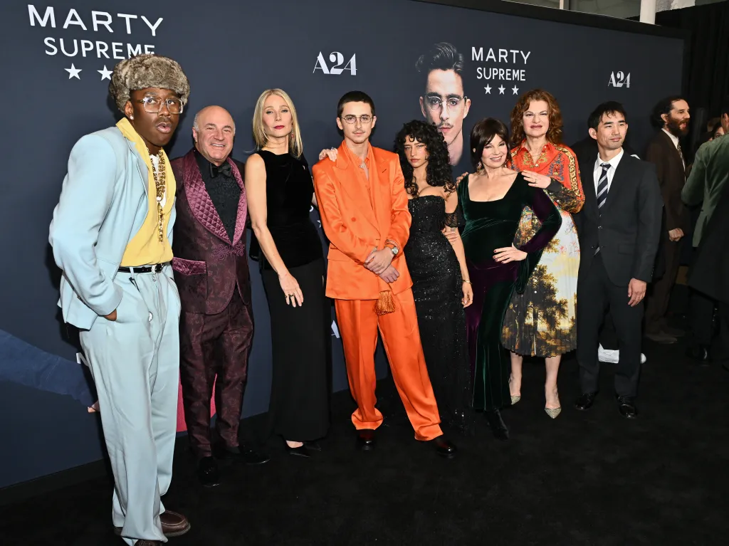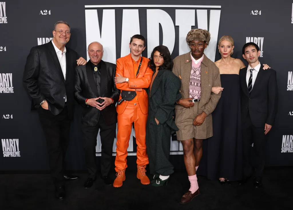 Set in the 1950s, the cast of “Marty Supreme” is rounded out by Gwyneth Paltrow, Odessa A’zion, Kevin O’Leary, Fran Drescher, and Tyler, the Creator.