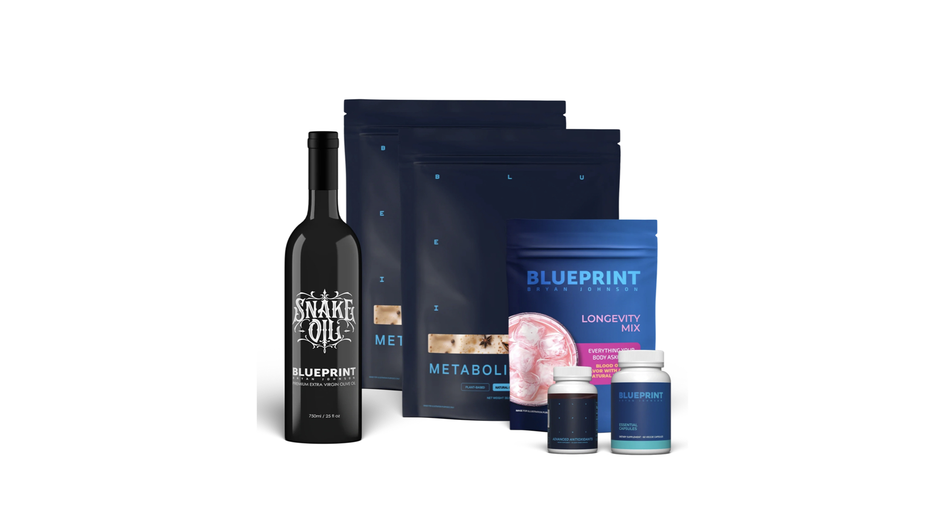Blueprint Bryan Johnson Medium StackMost biohackers are familiar with Bryan Johnson (aka “Don’t Die Guy”), the self-described “first human who will not die.” Johnson’s company, Blueprint, offers an assortment of science-based longevity products. The Medium Stack includes a few best-sellers, like the protein shake, multiple supplements, and his single-source olive oil, irreverently dubbed Snake Oil.