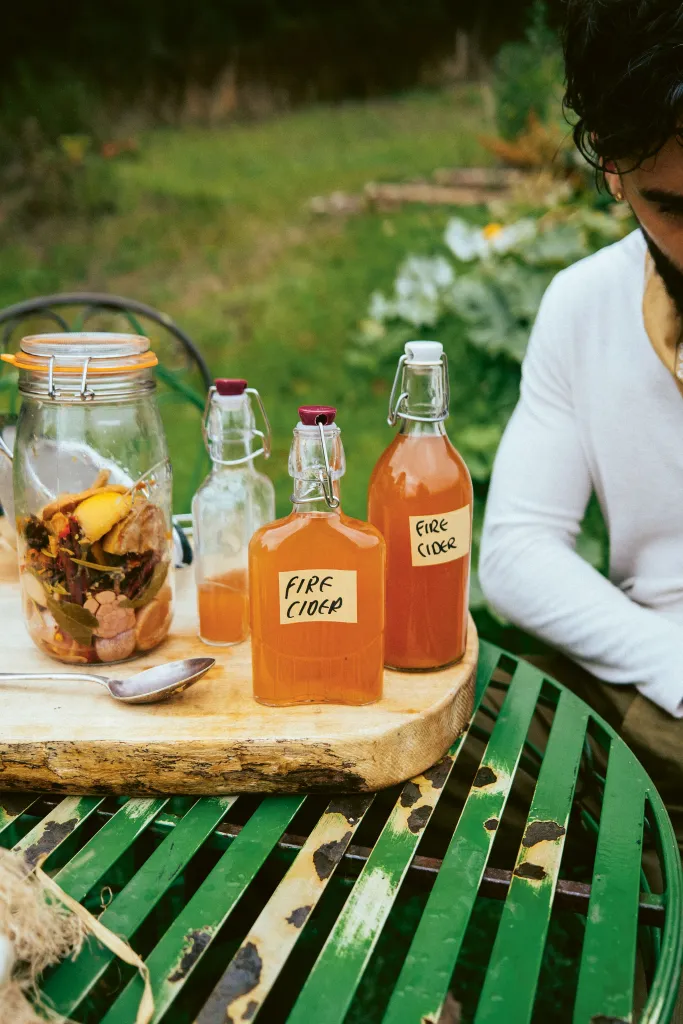 Once the cider has infused, Oakley strains the mixture and pours it into a sterilized glass container. The result? “A tonic that gives you a protective shield.”