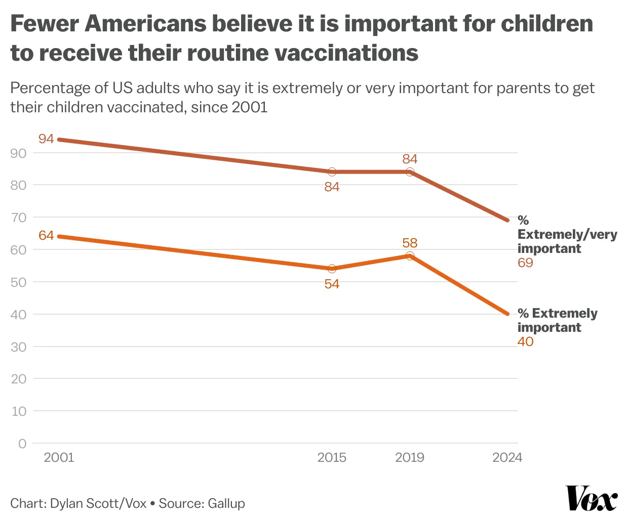 Fewer people are getting the annual flu shot and Covid-19 booster rates are pitifully low. Vaccination rates have been dropping not only for measles but for whooping cough, another deadly disease that is seeing a resurgence. Trust in experts and scientists is near an all-time low.