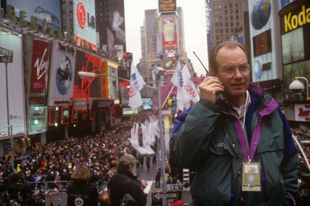 “Confetti king” Heining speaks into a walkie-talkie before New Year’s Eve 2000. Courtesy Treb Heining