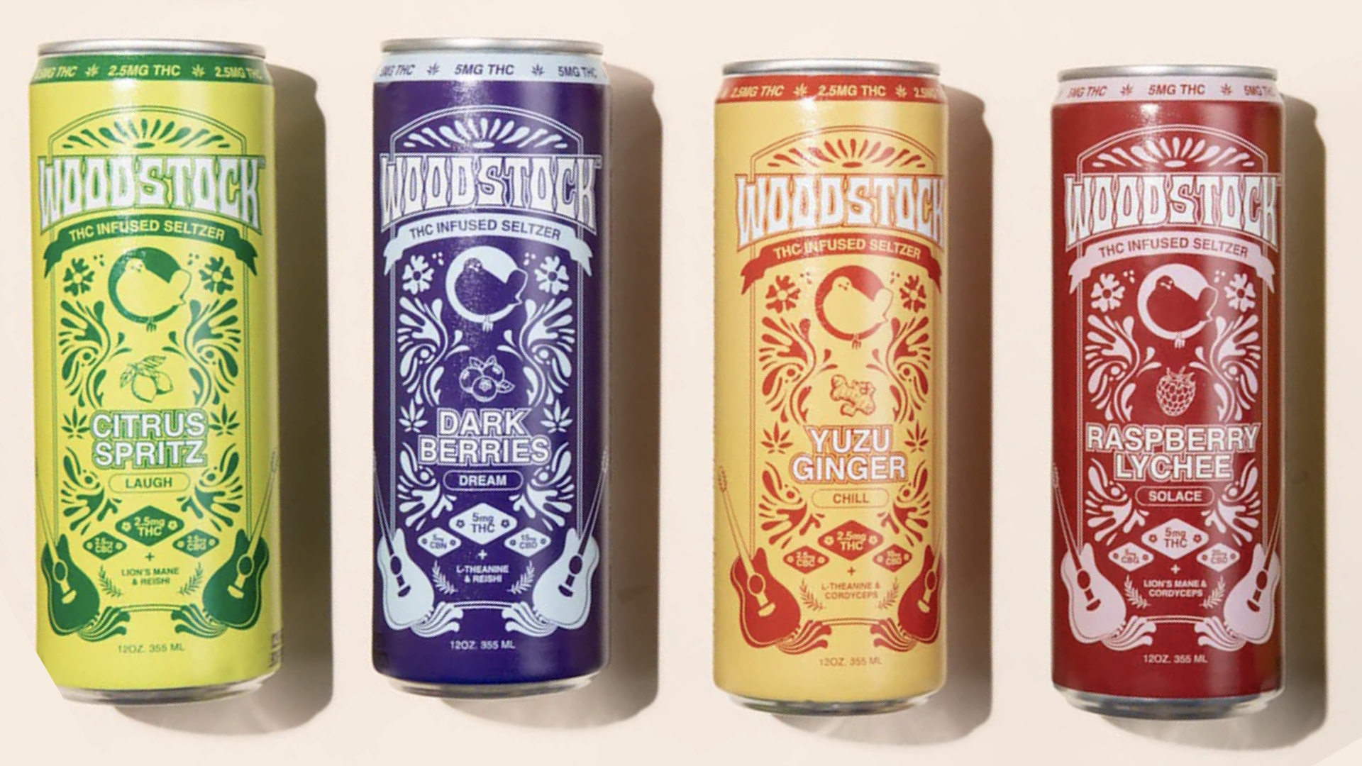 WoodstockAdaptogens are the buzzword of the day, a catch-all term for plant-based ingredients thought to help your body better manage stress. With Woodstock, alongside the flavor Yuzu Ginger is the word “chill.” Citrus Spritz is paired with “laugh.” Dark Berries, dream. Raspberry Lychee, solace. In addition to tweaking THC to CBD & CBG ratios, each drink also boasts different functional ingredients.