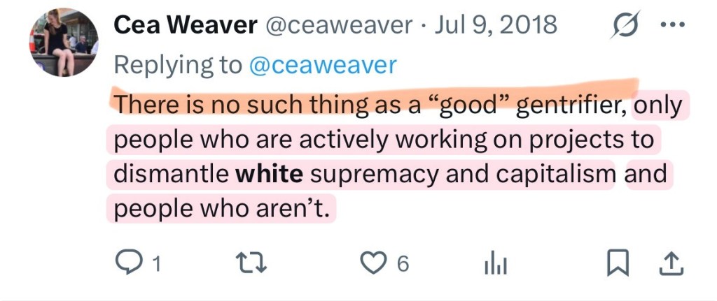 “There is no such thing as a ‘good’ gentrifier, only people who are working on projects to dismantle white supremacy and capitalism,” she wrote, adding, “and people who aren’t.”
