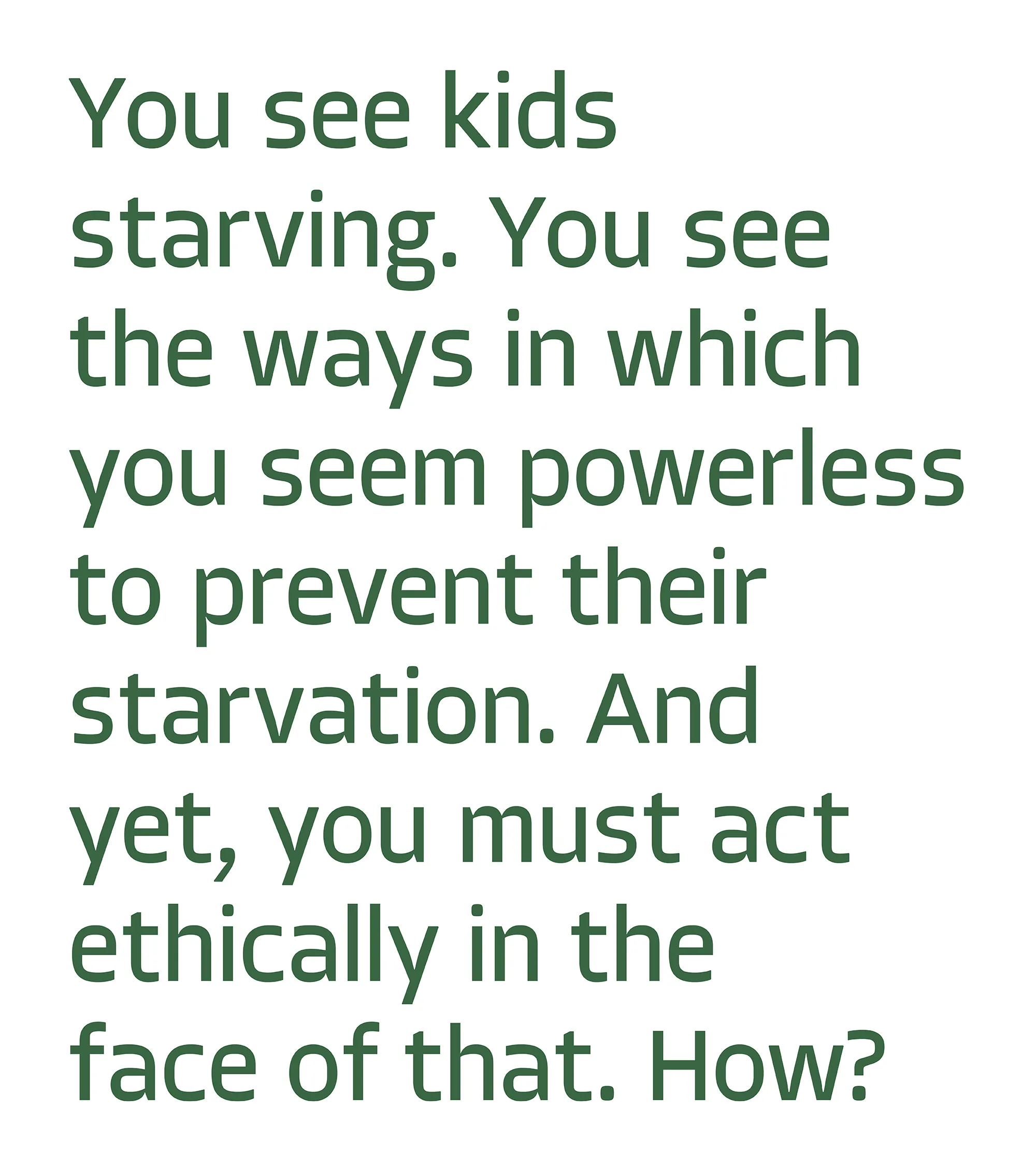 That poses a moral problem for the average person: You see kids starving. You see the ways in which you seem powerless to prevent their starvation even after you’ve done whatever you can politically or financially. And yet, you somehow must act ethically in the face of that. How?