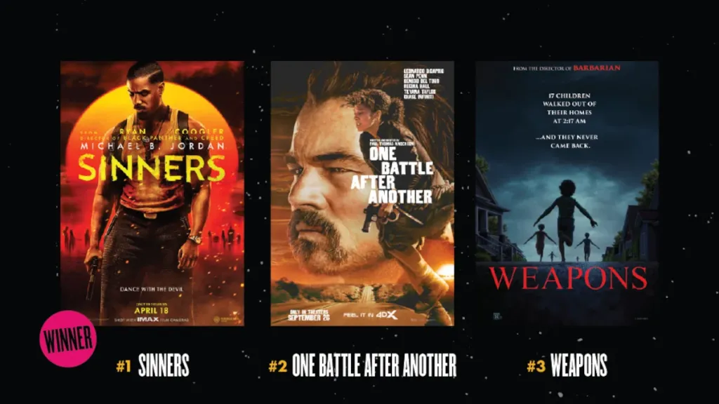 Patrons of the Alamo Drafthouse theater chain named “Sinners” the best film of the year, with Ryan Coogler’s vampire drama scoring 14.9% of points. Coming in a close second place was Paul Thomas Anderson’s “One Battle After Another,” with Zach Cregger’s “Weapons” rounding out the Top 3.