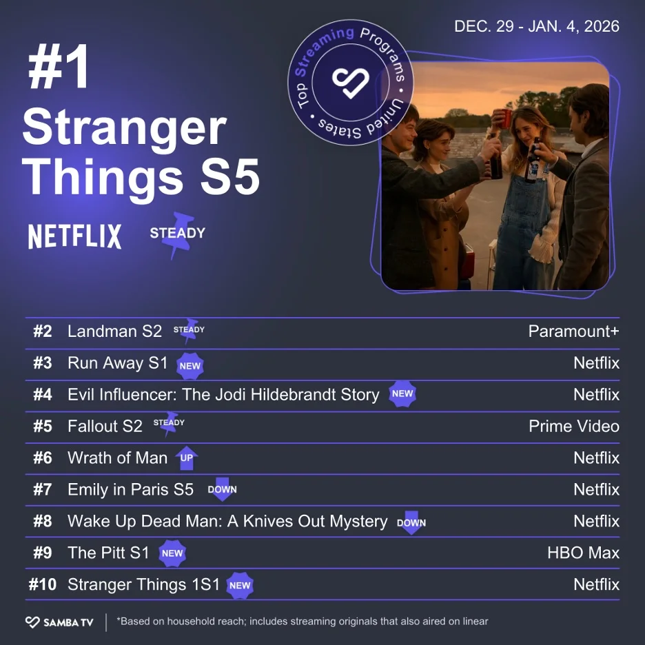 “Stranger Things” rules the roost this week, as the Netflix epic ended its five-season, 10-year run with a 2-hour finale delivered on New Year’s Eve. With 3.7 million U.S. households watching in the first five days it was available, the finale proved to be even more popular than Season 5’s first episode, which debuted on Thanksgiving day, and episode five, which arrived on Christmas.