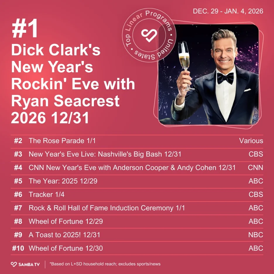 Switching the dial to linear, we find a chart full of familiar names ringing in the new year. ABC tops the chart with the epically-titled “Dick Clark’s New Year’s Rockin’ Eve with Ryan Seacrest.” In second place is the telecast of the annual Rose Parade held on New Year’s Day.