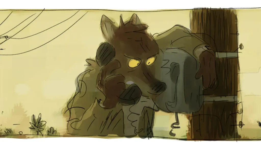 As he staged the sequence, Perifel conceived of a camera move that would mirror both characters. “The camera just starts wide and then slowly, across the cuts, comes in closer and closer and parallel between him and her, and then comes very close and lines up so that at the end their muzzles are facing close to each other,” he said.