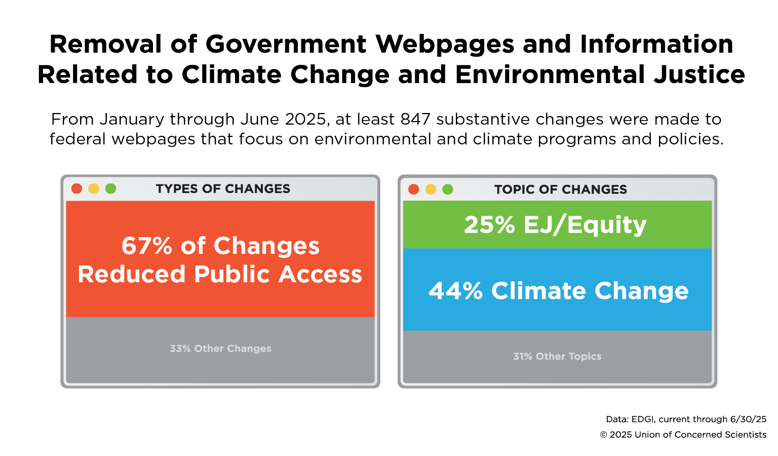 In its first three months, the second Trump Administration made 70% more changes to official environmental websites than were made during the same period of his first presidency. During the first six months, the Union of Concerned Scientists documented at least 847 “substantive” changes to federal webpages focused on the environment and climate—67% of these were changes that reduced public access.
