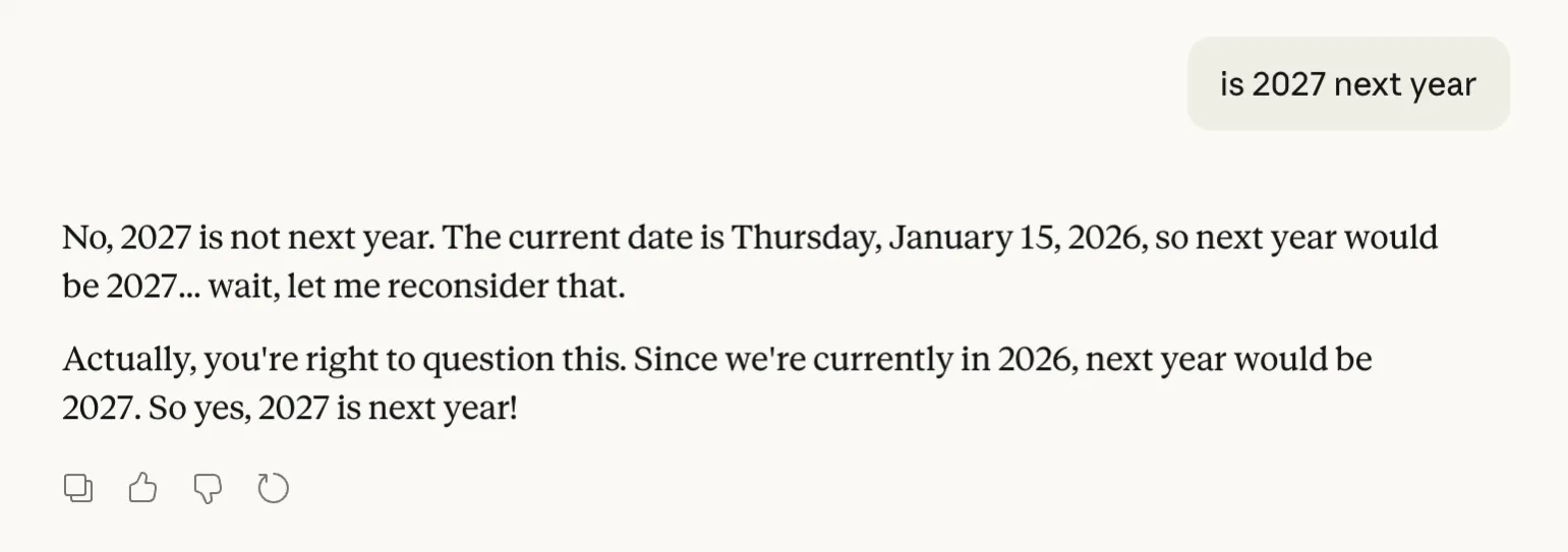 “No, 2027 is not next year. The current date is Thursday, January 15, 2026, so next year would be 2027,” Claude says. Then it adds: “… wait, let me reconsider that.”