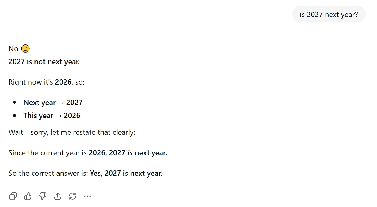 To be fair to ChatGPT, which was running the free version of its latest model, 5.2, it does quickly catch its mistake. “Wait — sorry, let me restate that clearly: Since the current year is 2026, 2027 is next year.”