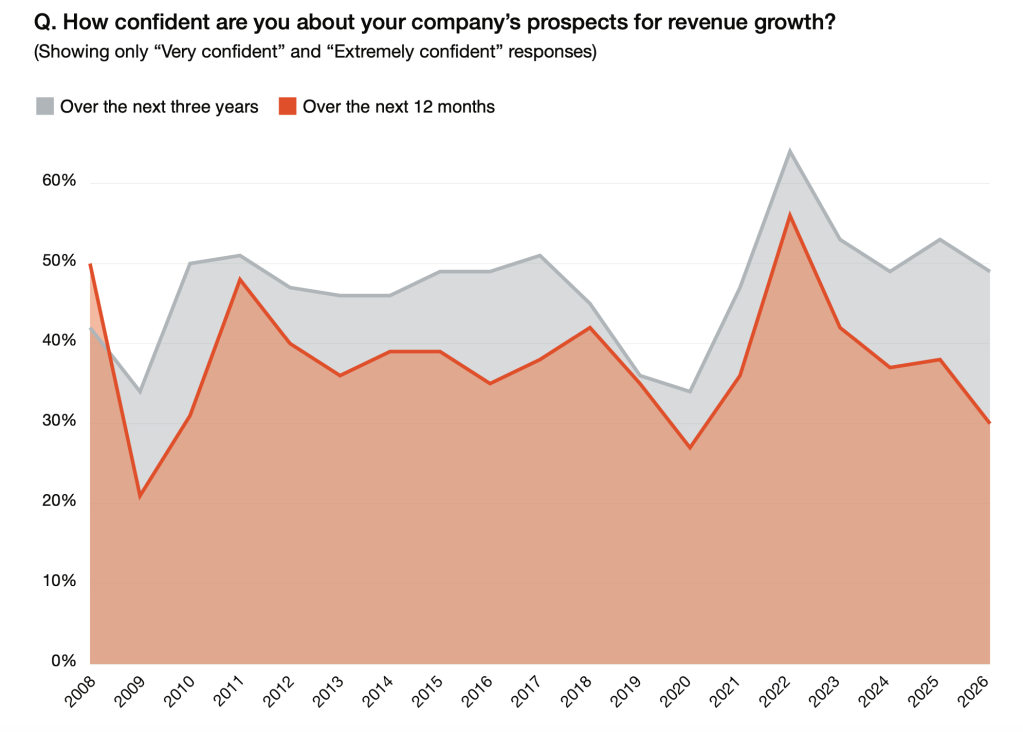Only three in 10 CEOs were confident in PwC’s 29th survey about revenue growth over the next 12 months, down from 38% in 2025 and 56% in 2022, marking a five-year low in CEO confidence in their own revenue outlook. Another survey question may be more revealing, about CEO confidence in their company’s 12‑month revenue growth: this has fallen sharply over recent years, even as many leaders continue to pursue multiyear opportunities to reinvent their businesses through AI, innovation, and cross-sector expansion.
