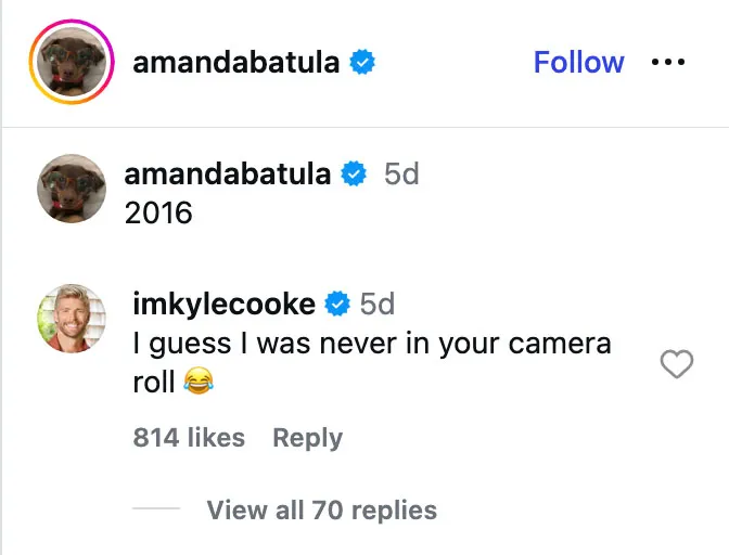 Kyle Cooke took a dig at Amanda Batula in a commment on her social media, just days before the “Summer House” stars announced their official split. In an Instagram post on Jan. 14, Batula, 34, shared a carousel of photos from 2016, in keeping with a currently popular viral trend. Her husband, Cooke, 43, was notably not present in any of the shots. “I guess I was never in your camera roll,” Cooke wrote in the comments section, adding a laugh-crying emoji. Five days later, the pair jointly announced their split on an Instagram Story post.