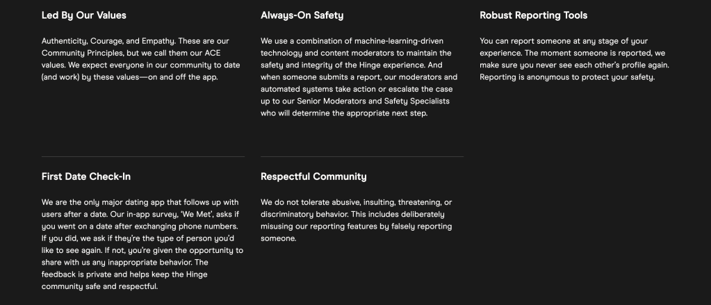 Hinge doesn’t pretend dating is risk-free. It has clear guidelines around respectful behavior and how users should engage with each other. It also publishes safe dating advice, including basics like meeting in public, trusting your gut, and keeping early conversations inside the app until you feel comfortable.