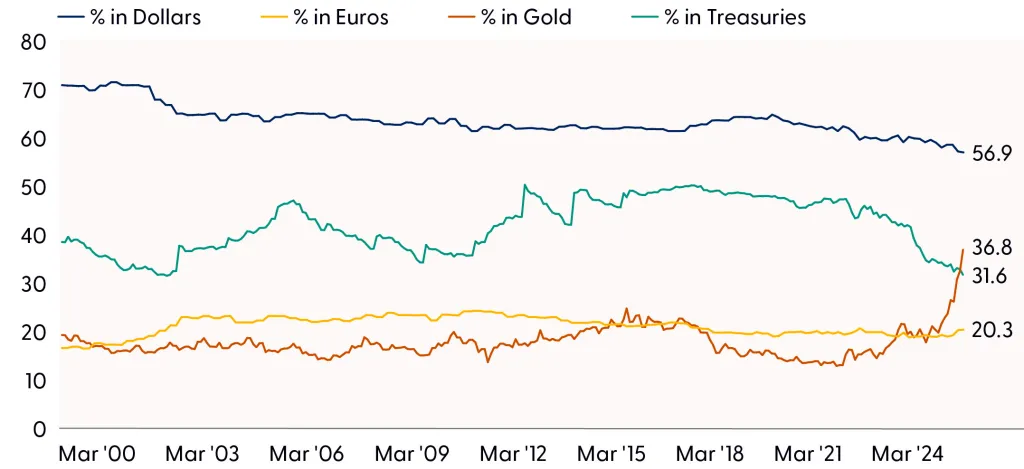 “Although we do not believe the dollar is at risk of losing its reserve‑currency status — given the lack of a viable alternative — central banks continue to diversify away from the greenback and U.S. Treasuries,” they wrote. “Gold has now surpassed both Treasuries and the euro as a share of global reserves, making it the second‑largest holding behind the dollar.”