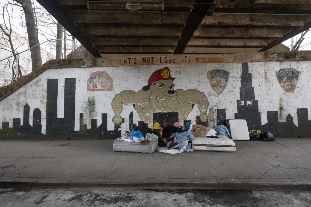 Two unhoused men in hooded jackets sit amidst their belongings, including mattresses and blankets, under a train bridge in Queens, NY.