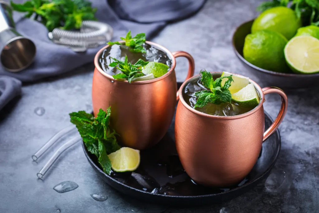 Classic Moscow mule cocktail with green lime, mint, ice in a copper mug on a black table.