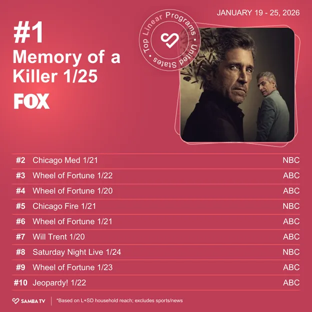 Having Sunday’s NFC Championship game as a lead-in certainly helped propel “Memory of a Killer” to the top of this week’s chart. We’ll track the Fox crime drama’s progress to see if the coveted debut slot leads to regular viewership … although it’s worth noting that last week’s recipient of the NFL boost, “The Fall and Rise of Reggine Dinkins,” is absent from this week’s chart.