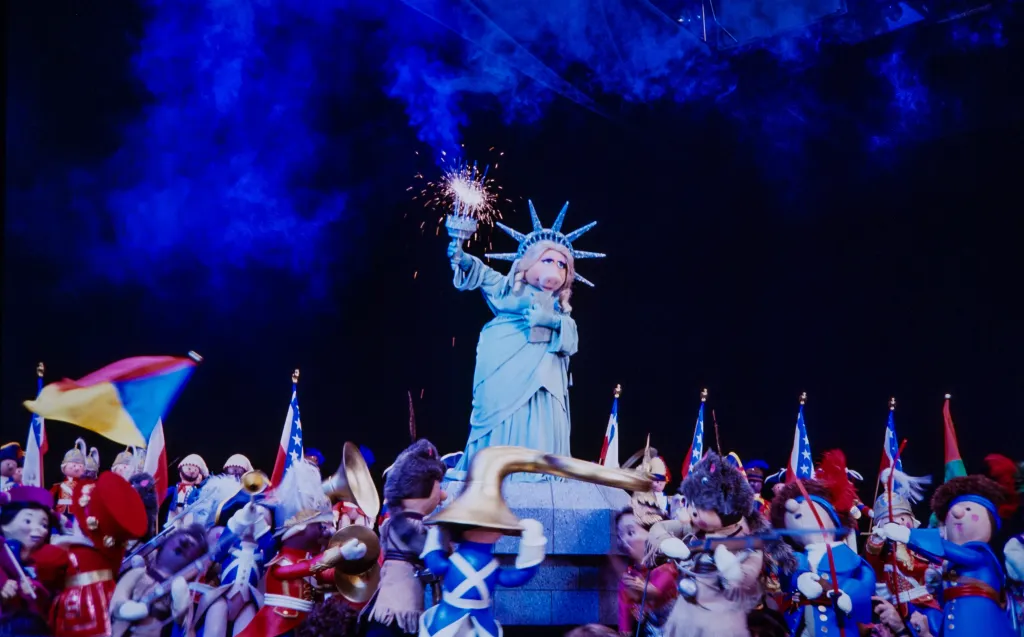 View of Muppet character Miss Piggy (performed by Frank Oz), dressed as the Statue of Liberty, among other Muppets, in a scene from the short film ‘Jim Henson’s Muppet*Vision 3D’ (also known as ‘Muppet Vision 3D’ and ‘Muppet Vision 4D’ (directed by Jim Henson) at Walt Disney Studios, Burbank, California, January 1990. (Photo by Steve Slocomb/Getty Images)