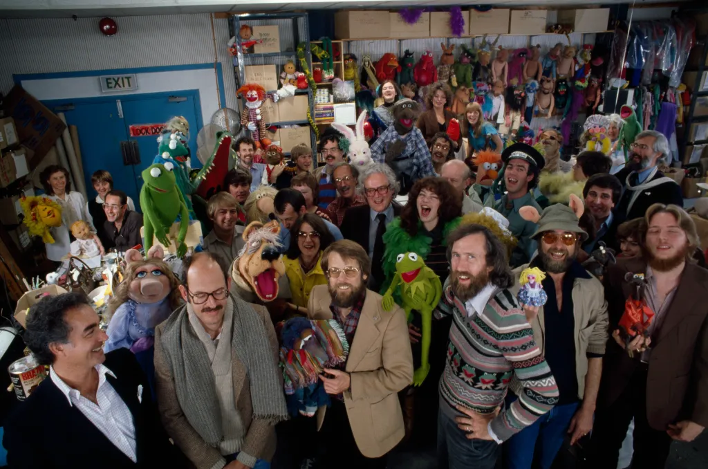 The artists and crew behind “The Muppet Show,” created and produced by Jim Henson (front, 3rd from L). (Photo by Nancy Moran/Sygma via Getty Images)