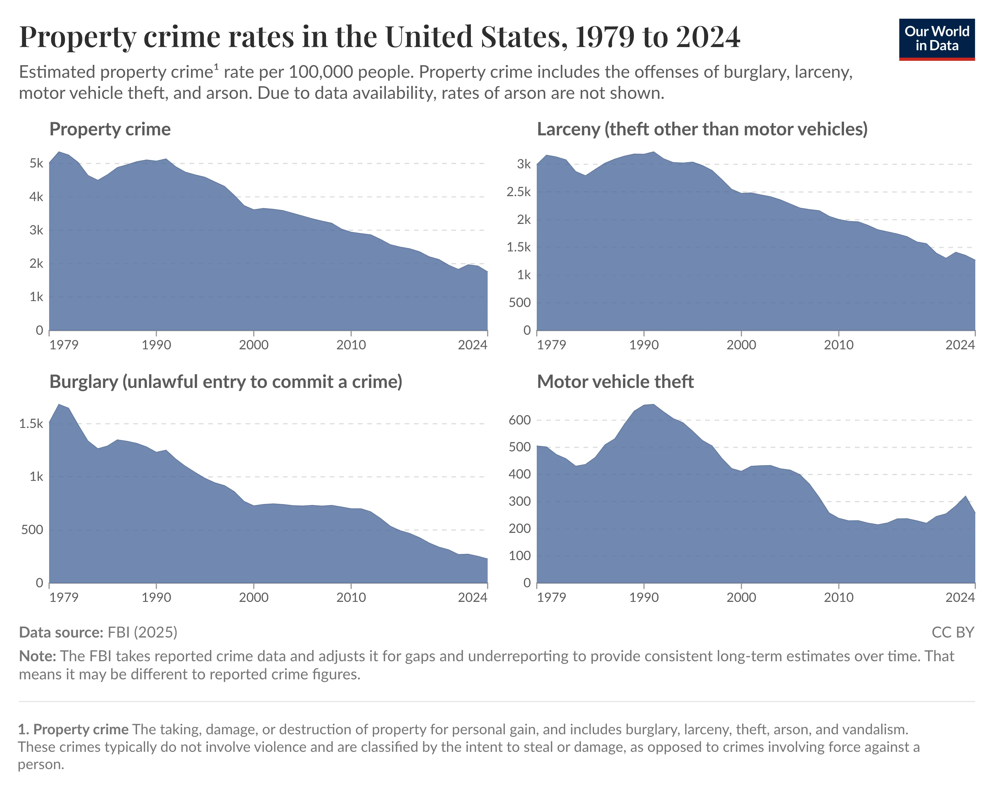 • The 2023–2024 drop was historic: Property crime fell 9 percent in a single year, the sharpest annual decline on record.