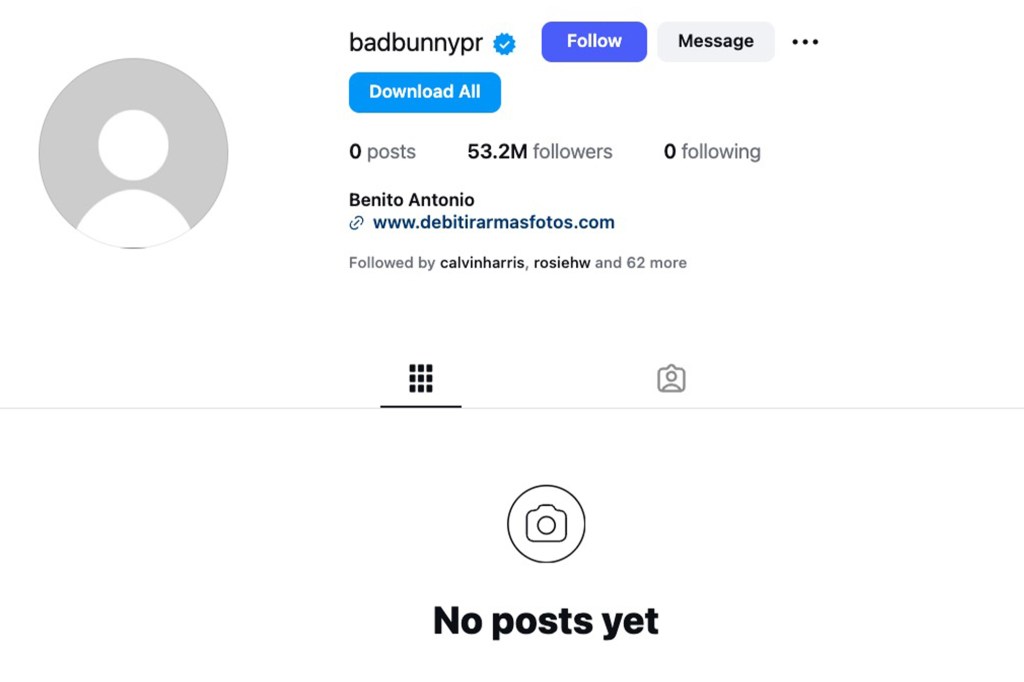 Bad Bunny’s Instagram account has no profile picture and there are no posts on his grid, leaving his more than 50 million followers stunned.