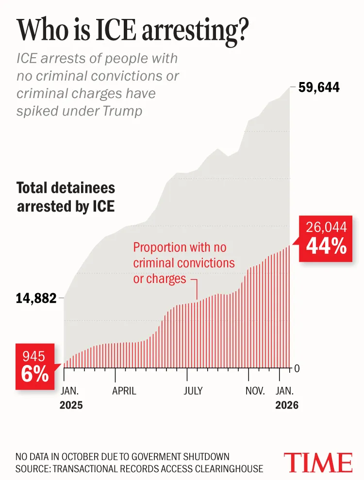 The data illustrates Trump’s commitment to mass deportations. The number of people arrested and detained by ICE who have no criminal convictions or pending charges has skyrocketed from 945, or 6% of all arrests, last January, to 26,044, or 44%, last month, according to data published by the Transactional Records Access Clearinghouse at Syracuse University. That spike reflects a dramatic transformation in how the country’s immigration system treats people who are in the country unlawfully, but have no criminal convictions or pending criminal charges.