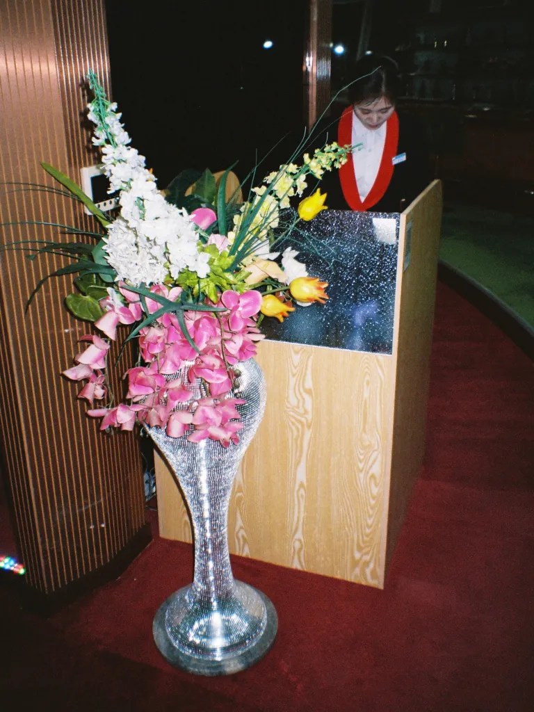 I say “supposedly” because outside of the major hotels and Pyongyang’s more flamboyant avenues, most of the city still suffers at the whims of infrastructure dating back more than a century. Once night falls, entire neighborhoods are often plunged into darkness. What light does remain falls upon familiar sights, repeating again and again: cracked asphalt, plastic flowers, 1990s hi-fi systems, clothes also belonging to the last century, the dance at the foot of the Juche Tower, the desperately empty restaurant of the Yanggakdo Hotel.