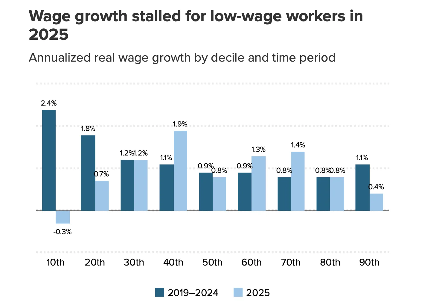 And the slowdown was especially sharp at both the top and bottom of the income ladder: The highest-earning decile of Americans saw their real wages grow by just 0.4 percent in 2025, compared to an average pace of 1.1 percent during the five years prior. Meanwhile, real wages actually fell for the poorest decile of workers, after climbing at a 2.4 percent annual clip from 2019 through 2024.