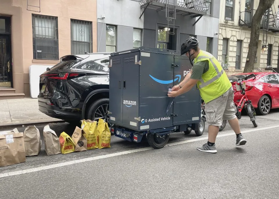 An employee uses a cargo trailer towed by an electric bicycle to deliver Amazon Fresh food orders purchased online by Prime customers in 2024. This electric vehicle system was launched to reduce emissions from Amazon trucks, alleviate traffic in New York City, and speed up delivery times.