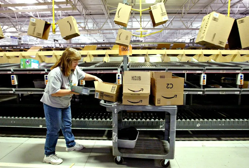 An employee packs products into boxes for shipping at Amazon’s fulfillment Center in Fernley, Nev., on Dec. 13, 2005. The Fernley Center expected to process approximately 2 million orders between Thanksgiving and Christmas of that year.