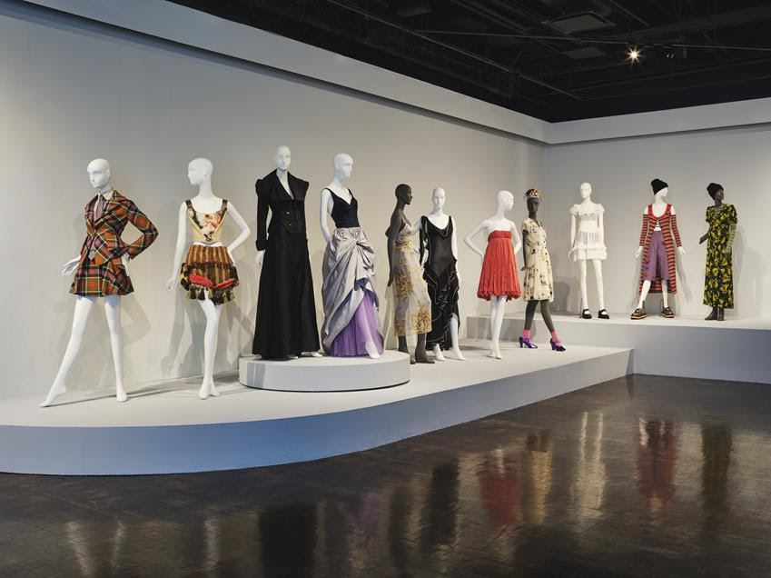 Grunge looks by Anna Sui, Christian Francis Roth and Marc Jacobs share space with differing approaches to tailoring from Jean-Paul Gaultier, Vivienne Westwood and Yohji Yamamoto, conceptual Japanese fashion by Issey Miyake and Comme des Garcons, and Carolyn Bessette-style American minimalism from Calvin Klein.