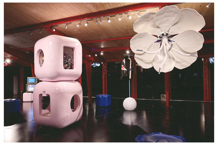 Oversized knit flowers hang from the ceiling with their shoelace pistils dangling while white supersized beads dot the floor referencing the friendship bracelet beads in the brand’s new Puma collaborative sneaker.