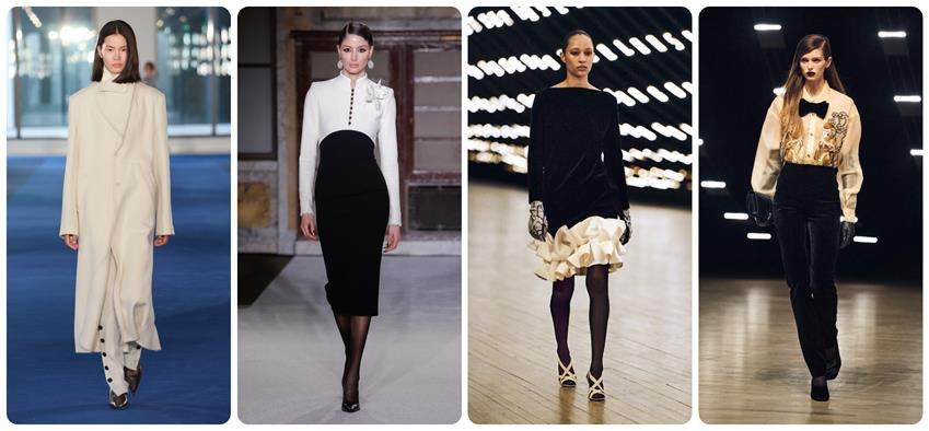 Awards season red carpets have already been dominated by black and white, and New York designers hit the classic combo, too, from the sleek white tailoring and black-and-white houndstooth outerwear at Proenza Schouler, to Sergio Hudson’s sexy skirted take on a tuxedo, to Khaite’s ivory ruffle-trimmed black velvet dress and romantic riffs on tuxedo suiting.