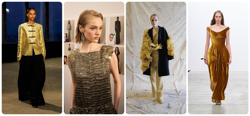 For those feeling more flush, gold is a rich new statement hue, as seen on a gorgeous Kallmeyer Chinoiserie jacket, densely embroidered Ralph Lauren dress, glittery Libertine pants, tunic and evening gloves look, and a very Bronte-core Fforme corset gown.
