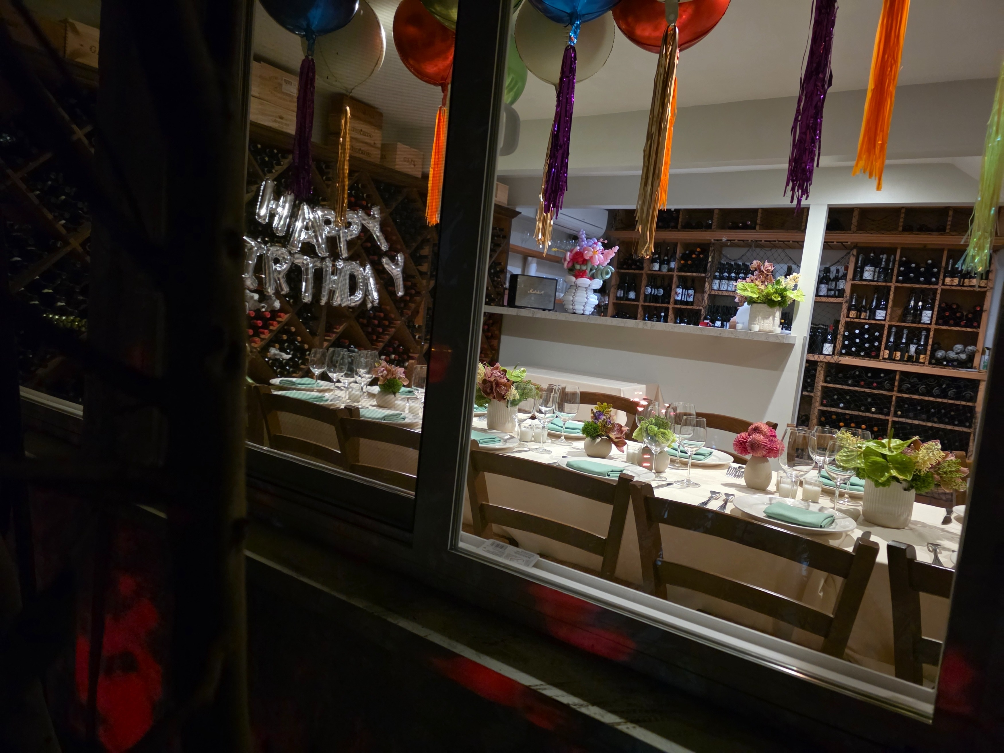 The private room was decorated with silver balloons that read “Happy Birthday” and a slew of red, white, green and blue balloons floated above the table, as well.
