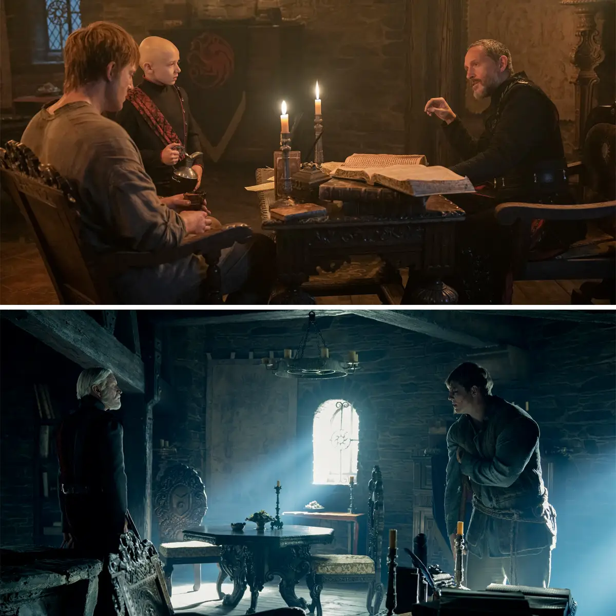 When Dunk has a private meeting with Baelor in episode four, the castle is lit with candles and warm flickers of light. But when he returns to the same room in episode six to speak with Maekar, the lighting is cold and harsh.