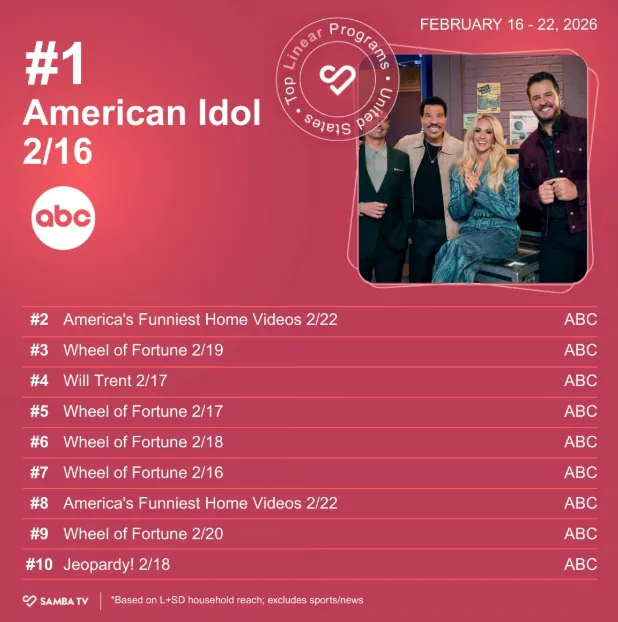Linear TV continues to experience some winter doldrums. Once again, “American Idol” tops the chart, upping its streak to four-straight weeks. “Will Trent,” in fourth place, is the lone scripted show to make the Top 10 this week.