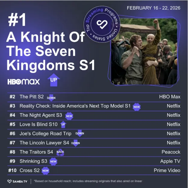 After “Knight” we have “The Pitt,” the award-winning hospital drama that has steadily climbed the streaming chart over the course of its second season. The show slides down one spot this week, but with “A Knight of the Seven Kingdoms” now wrapped, it has an open runway for the final eight episodes of its season.