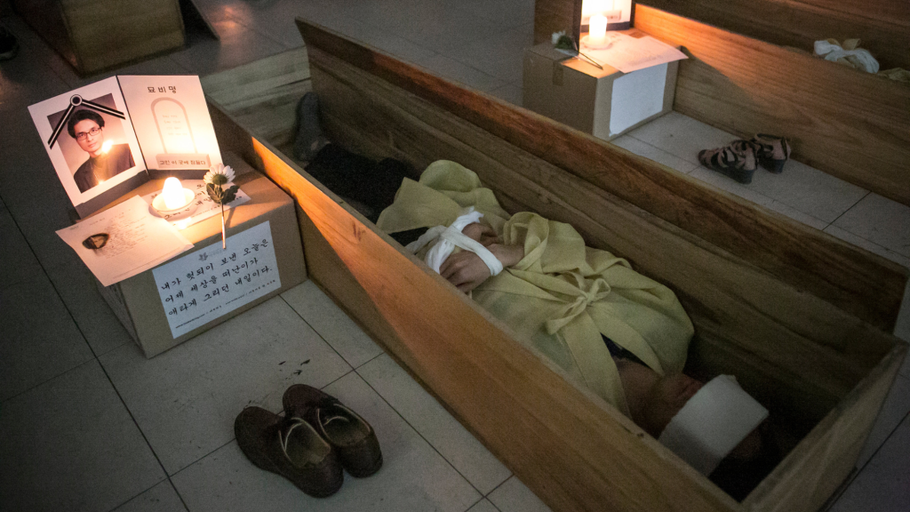 “Death Experience/Fake Funeral,” A 2016 Coffin meditation Event in South Korea. (Photo by Jean Chung/Getty Images)
