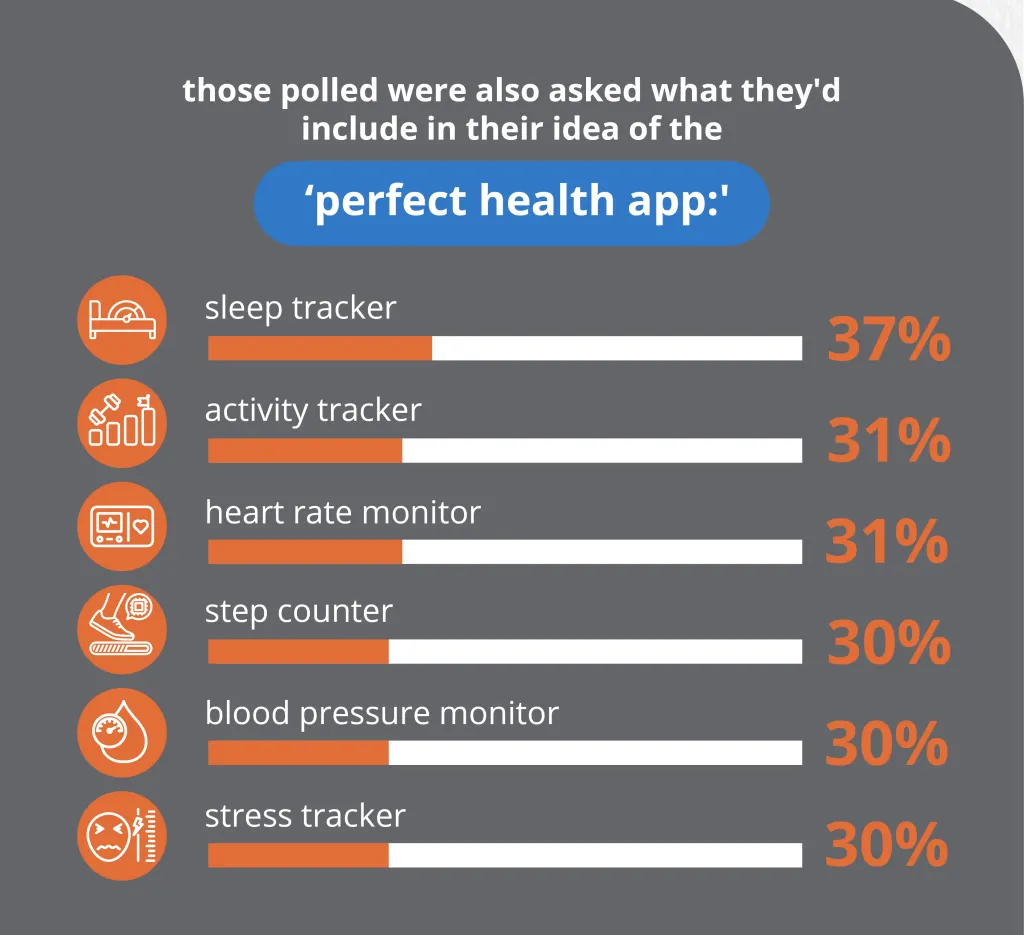 Those polled were also asked what they’d include in their idea of the “perfect health app,” and a sleep tracker scored the highest (37%). That was followed by an activity tracker (31%), a heart rate monitor (31%), a step counter (30%), a blood pressure monitor (30%), and a stress tracker (30%).