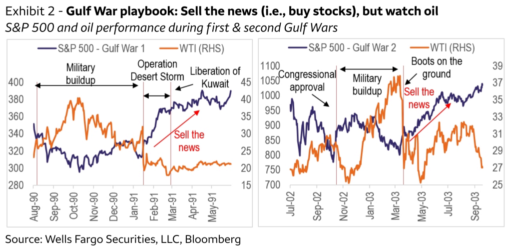 - At Wells Fargo, Ohsung Kwon and his colleagues noted that in the months after the first and second Gulf Wars the S&P 500 rose 16% and 14%, respectively.
