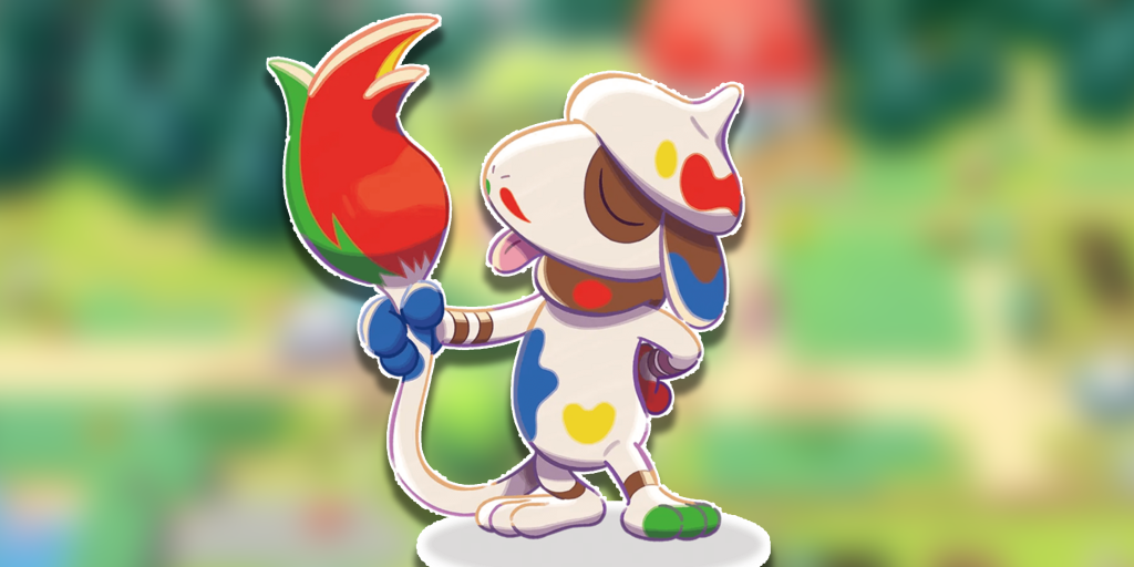 Smearguru is Pokemon Pokopia’s special variant of Smeargle, the painter Pokemon. As it is with this Pokemon’s nature, Smearguru is covered in colorful paint splotches and has a much larger ‘brush’ end on its tail.