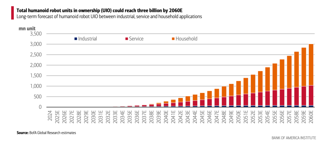 In a detailed research note, BofA Global Research projects that the global humanoid robot population will reach 3 billion units by 2060—surpassing the world’s roughly 1.5 billion cars on a per-capita basis. By that point, the bank estimates 62% of all humanoid robots, or roughly 2 billion units, will be deployed inside people’s homes. It’s a striking number for a product category with essentially zero market penetration today, but BofA points to an undeniable economic fact of 21st century life as a major motivator: there won’t be enough workers.​