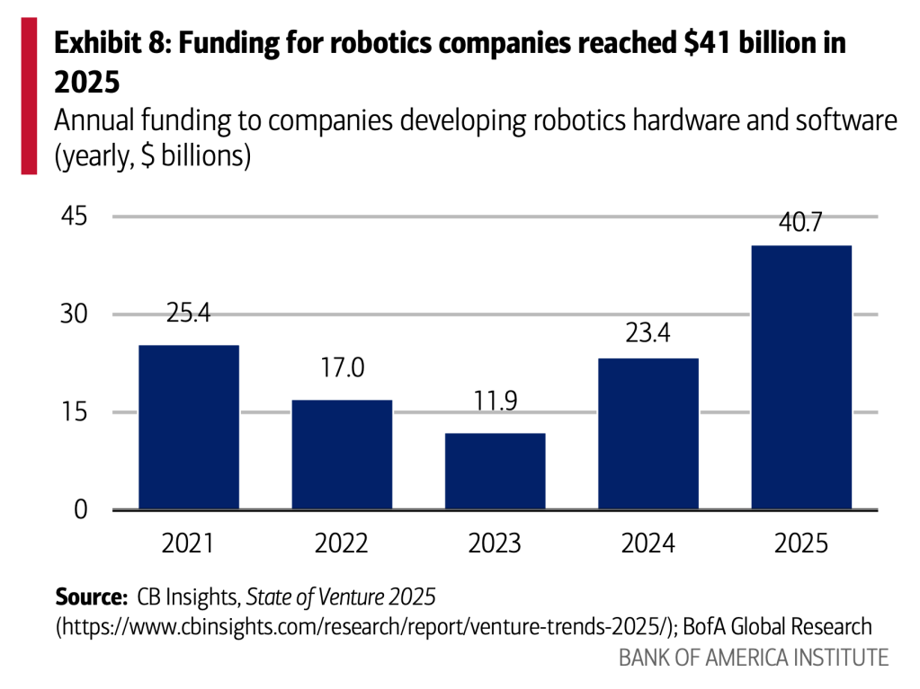 Investment in companies looking to develop physical, artificially intelligent robots made 32 equity deals with developers in 2025 compared to just three in 2021, according to Bank of America’s Vanessa Cook and Lynelle Huskey. Funding hit a record high in 2025 at $41 billion.