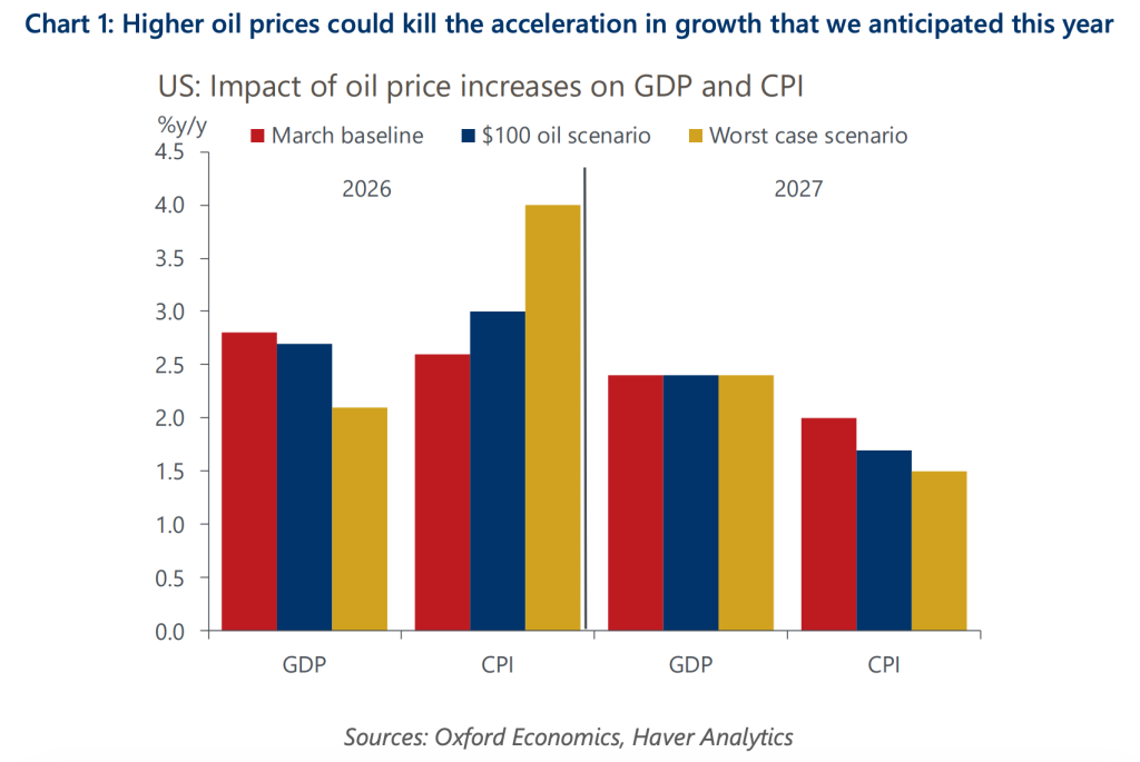 $100 oil will “break parts of the world economy”. Oxford Economics’ Michael Pearce told clients that the impact of oil going to $100 per barrel is “a worst-case scenario that begins to break parts of the world economy. The impact to the U.S. economy is still mostly via higher gasoline prices, which boost inflation and weigh on households’ real disposable incomes and consumer spending. There would be some offset from higher oil production and investment, but there’s a lag effect, and in the near term, the economy would take a hit,” with GDP growth being cut by the better part of a percentage point: